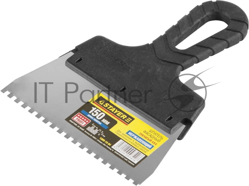 Шпатель STAYER PROFESSIONAL нержавеющий зубчатый с пластмассовой ручкой, 150мм, зуб 4х4мм