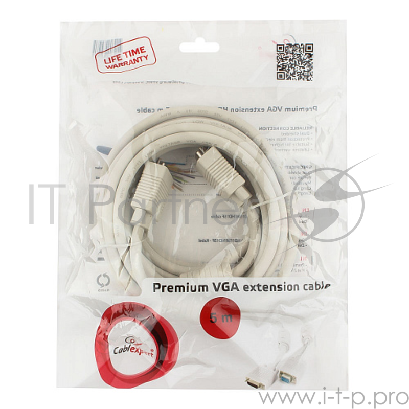 Кабель Gembird/Cablexpert CC-PPVGAX-5m , Кабель удлинитель VGA Premium , 5.0м, 15M/15F, серый, тройной экран, феррит.кольца