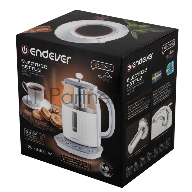 Чайник электрический Endever Skyline KR-364G, белый, мощность 1850 Вт, емкость 1,5 л, корпус из пластика, стекла и нержавеющей стали, 6 шт/уп.