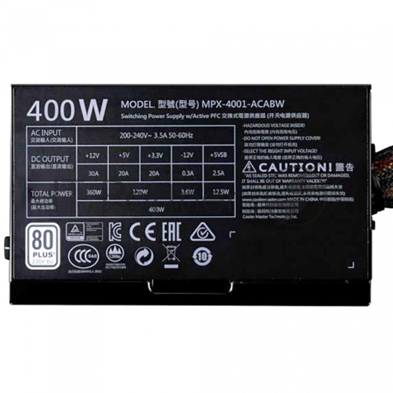 Блок питания Cooler Master MWE White, 400W, ATX, 120mm, 6xSATA, 1xPCI-E(6+2), APFC, 80+ White CLM-MPE-4001-ACABW-EU