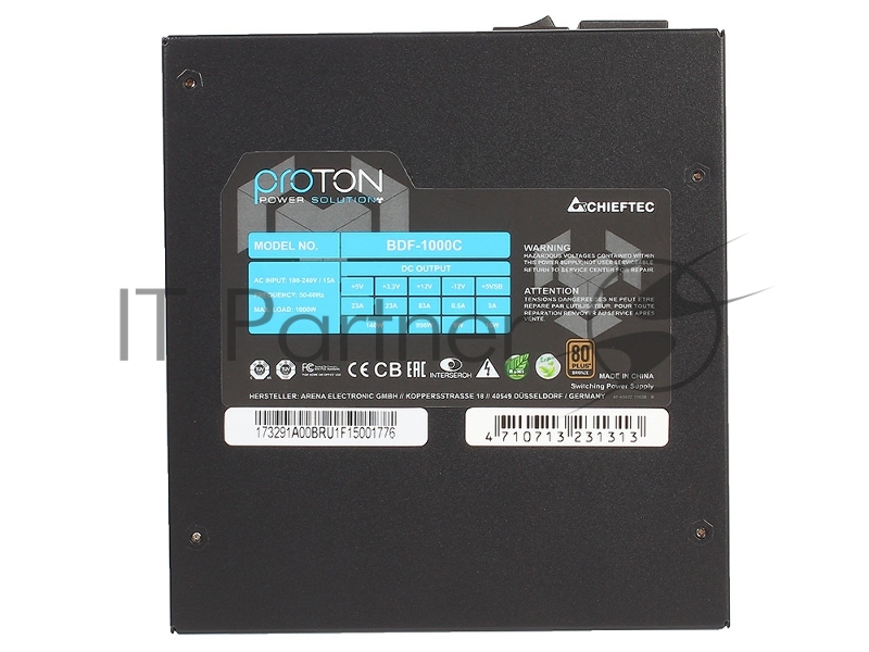 Блок питания Chieftec 1000W Retail BDF-1000C [Proton] МОДУЛЬНЫЙ, ATX v.2.3/EPSx2, 80+BRONZE >85%, A.PFC, 6x PCI-E (6+2-Pin), 9x SATA, 3x MOLEX, Fan