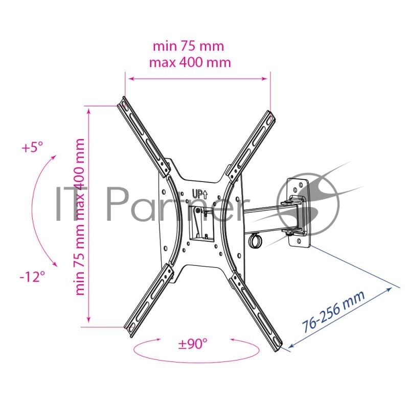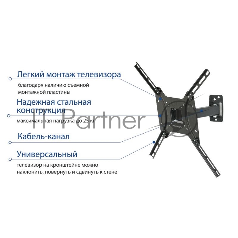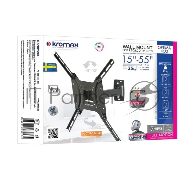 Крепеж Kromax OPTIMA-403 black {Кронштейн для LED/LCD телевизоров 15-55, max 25 кг, настенный, 3 ст свободы, наклон +5°-12°, поворот ±90°, от стены 68.5-225 мм, max VESA 400x400 мм}