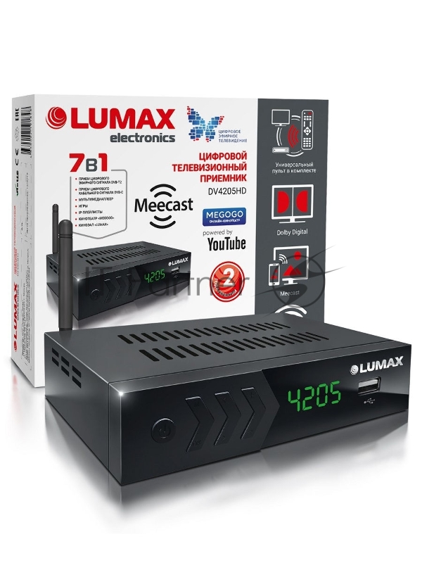 Приставка DVB-T2 LUMAX Приставка DVB-T2 LUMAX/ GX3235S, эфирный + кабельный, Металл, 7 кнопок, дисплей, USB, 3RCA, HDMI, внешний б/п, встроенный Wi-Fi адаптер, Кинозал LUMAX (более 500 фильмов)