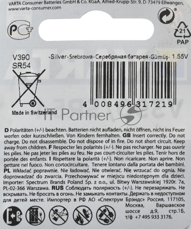 Элемент питания VARTA V 390 бл.1