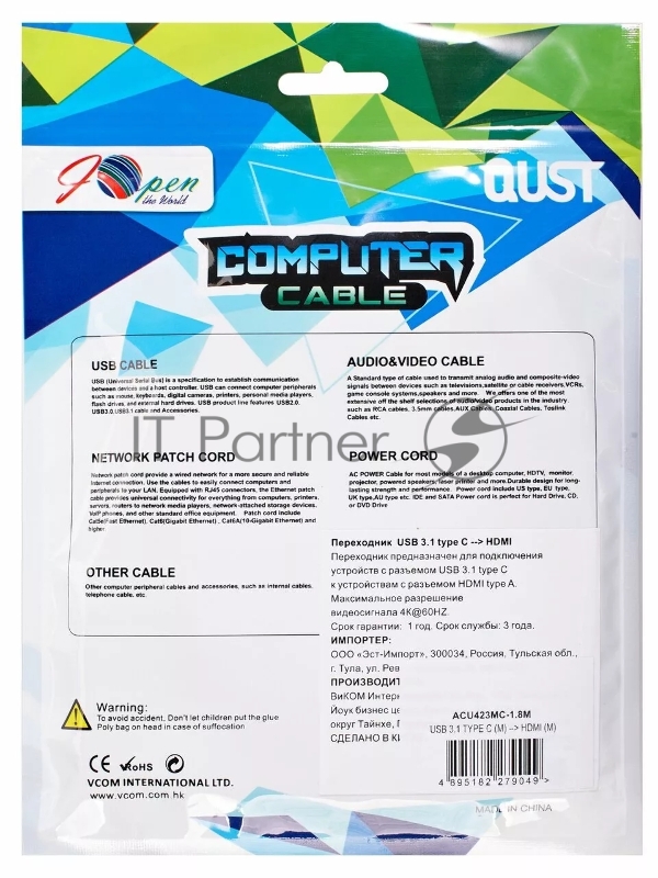 Кабель USB 3.1 Type-Cm --> HDMI A(m) 4K@60Hz,1.8m,Alum,iOpen(Aopen/