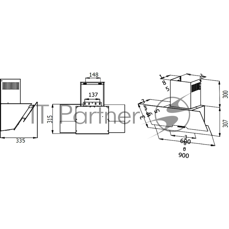 Наклонная вытяжка, 60 см, механический контроль, 3 скорости работы, производительность 900 м3/ч, LED освещение, черный, металл, стекло, 600х335х395-607 мм.