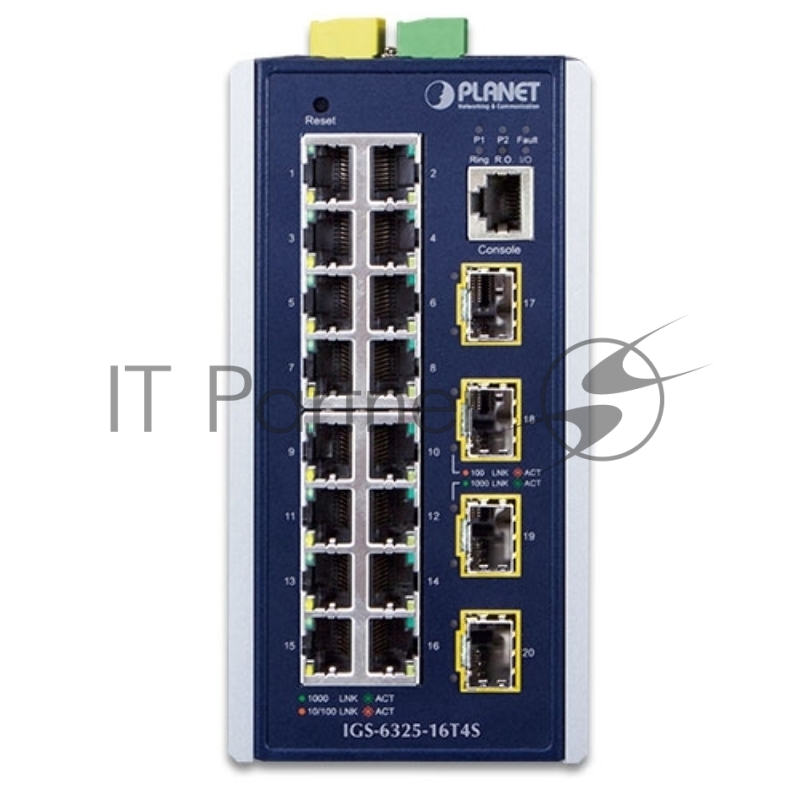 Коммутатор PLANET IGS-6325-16T4S IP30 Industrial L3 16-Port 10/100/1000T + 4-port 1G/2.5G SFP Full Managed Switch (-40 to 75 C, dual redundant power input on 9~48VDC terminal block, 2*DI, 2*DO, ERPS Ring, 1588 PTP TC, Modbus TCP, Cybersecurity featur