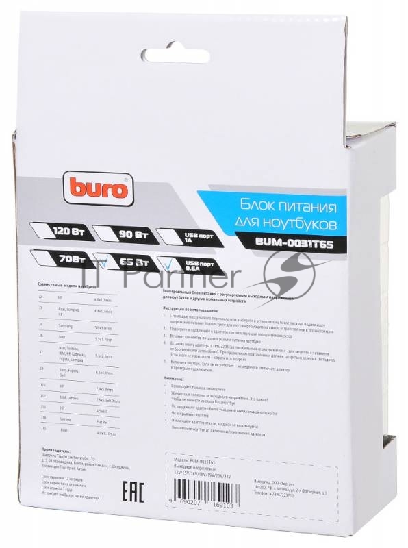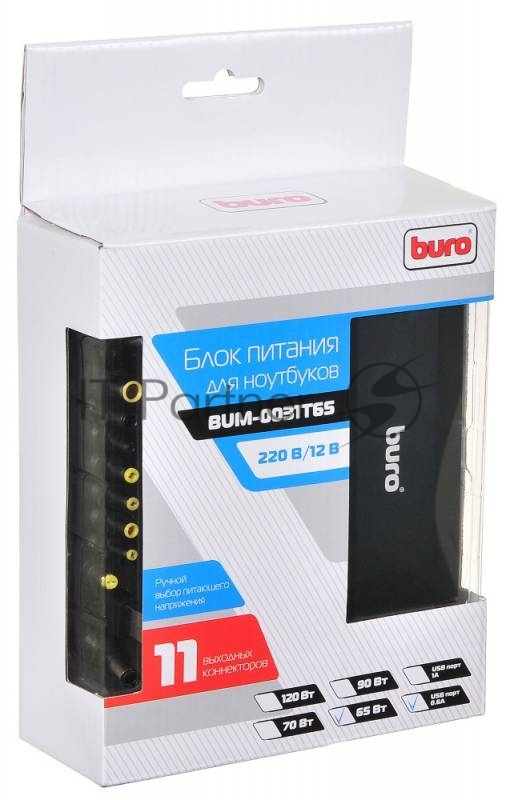 Блок питания Buro BUM-0031T65 ручной 65W 12V-24V 11-connectors 3.2A 1xUSB 0.6A от бытовой электросети/от прикуривателя