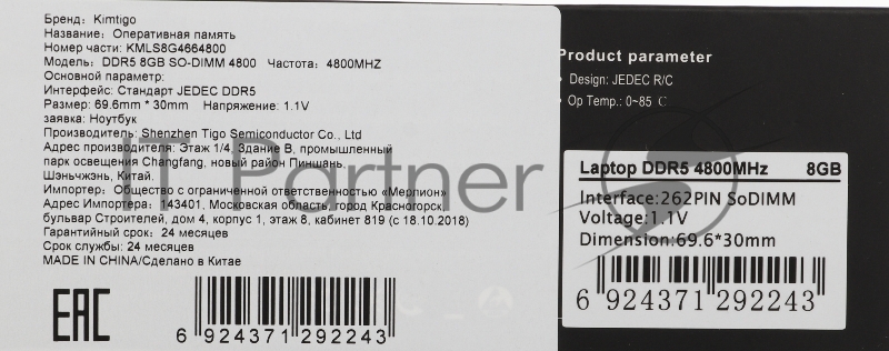 Память DDR5 8Gb 4800MHz Kimtigo KMLS8G4664800 RTL PC4-21300 CL19 SO-DIMM 260-pin 1.2В single rank