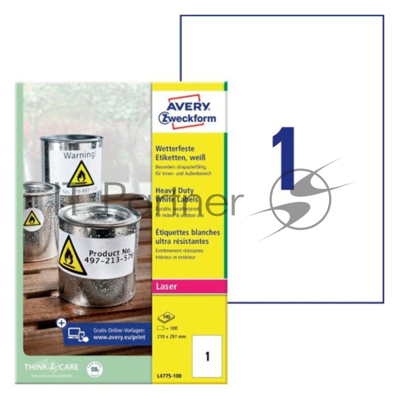 Этикетки Avery Zweckform L4775-100 A4 297x210мм 1шт на листе/75г/м2/100л./белый самоклей. для лазерной печати
