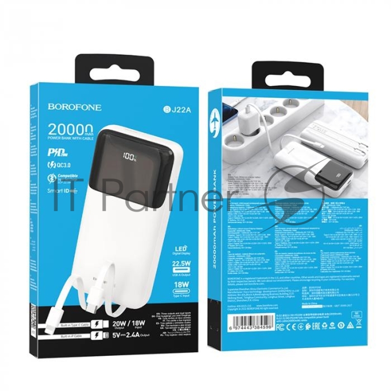 Внешний аккумулятор BOROFONE BJ22A 22.5W+PD20W, дисплей, кабель Type-C, 8-pin, 3.0А (20000mAh), белый