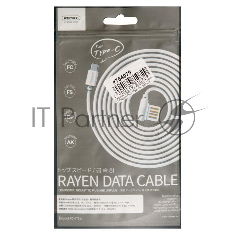 Кабель USB 2.1A REMAX Type-C Rayen RC-075a 1м, белый