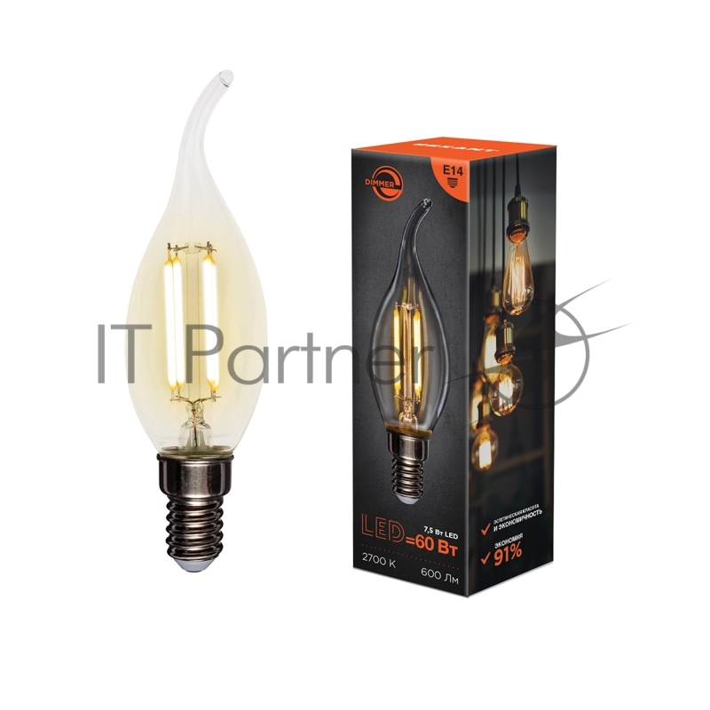 Лампа филаментная REXANT Свеча на ветру CN37 7.5 Вт 600 Лм 2700K E14 диммируемая, прозрачная колба