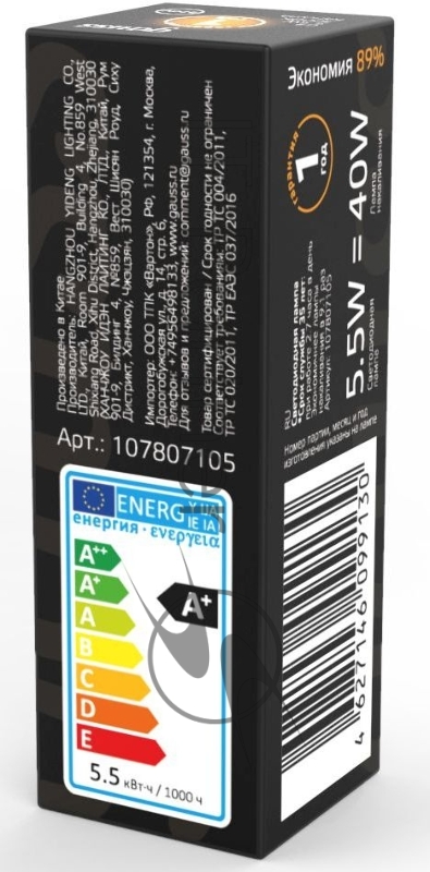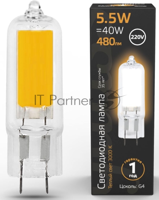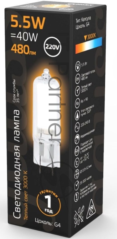 Лампа Gauss LED G4 AC220-240V 5.5W 3000K Glass 1/10/200