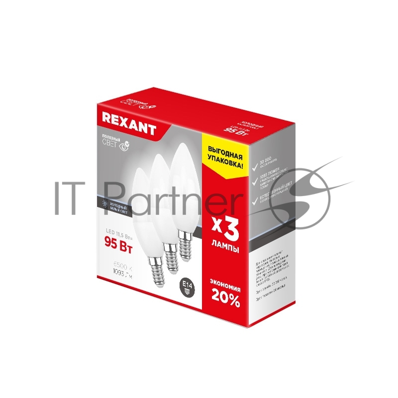 Лампа светодиодная REXANT Свеча CN 11.5 Вт E14 1093 Лм 6500 K холодный свет (3 шт./уп.)