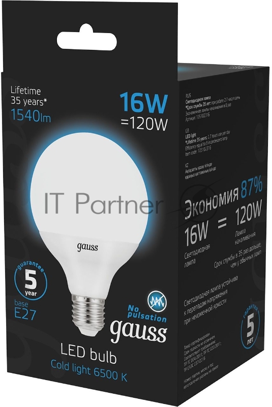 Лампа G95 16W 1400lm 6500K E27 LED