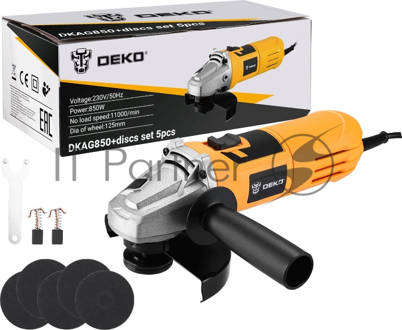 Углошлифовальная машина Deko DKAG850+ набор дисков 5шт. 850Вт 11000об/мин рез.шпин.:M14 d=125мм