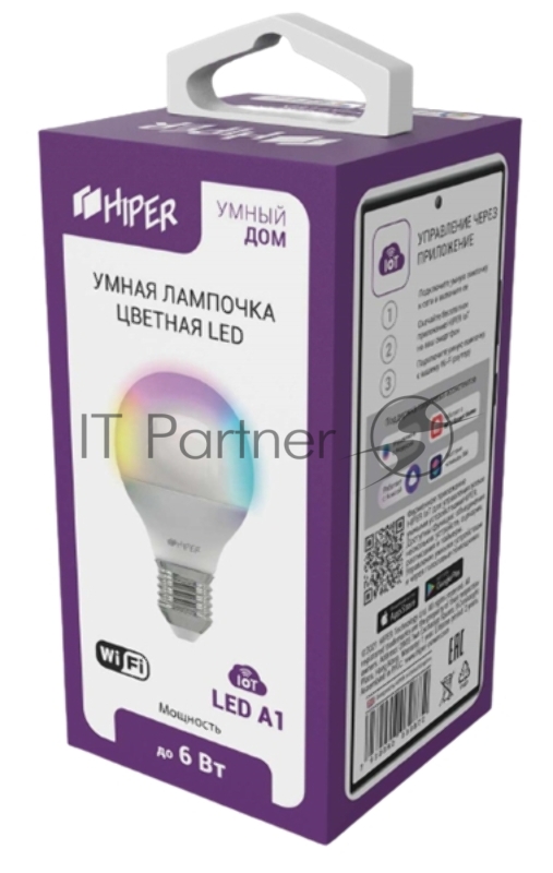 Умная лампочка HIPER Smart LED bulb IoT LED A1 RGB/Умная LED лампочка/Wi-Fi/Е27/Globe G45/Регулируемая яркость и цвет/6Вт/2700К-6500К/520 лм/IoT LED A1