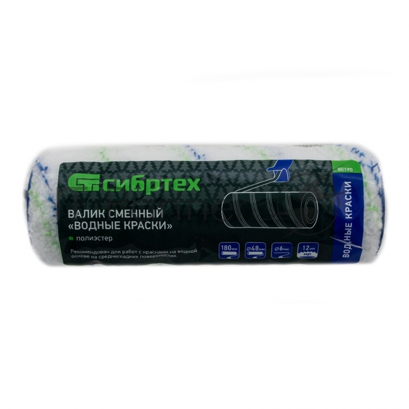 Валик сменный Водные краски, 180 мм, ворс 12мм, D - 48 мм, D ручки - 6 мм, полиэстер// Сибртех