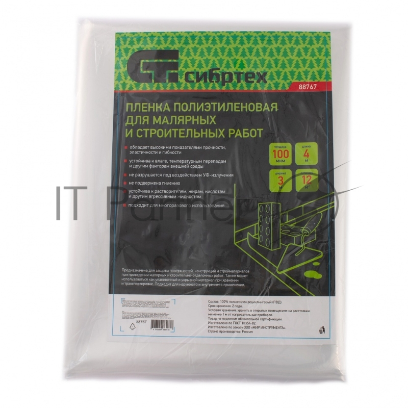 Пленка полиэтиленовая для малярных и строительных работ, 3 х 4 м, 100 мкм// Сибртех