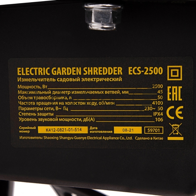 Измельчитель садовый электрический ECS-2500, 2500 Вт, 45 мм// Denzel