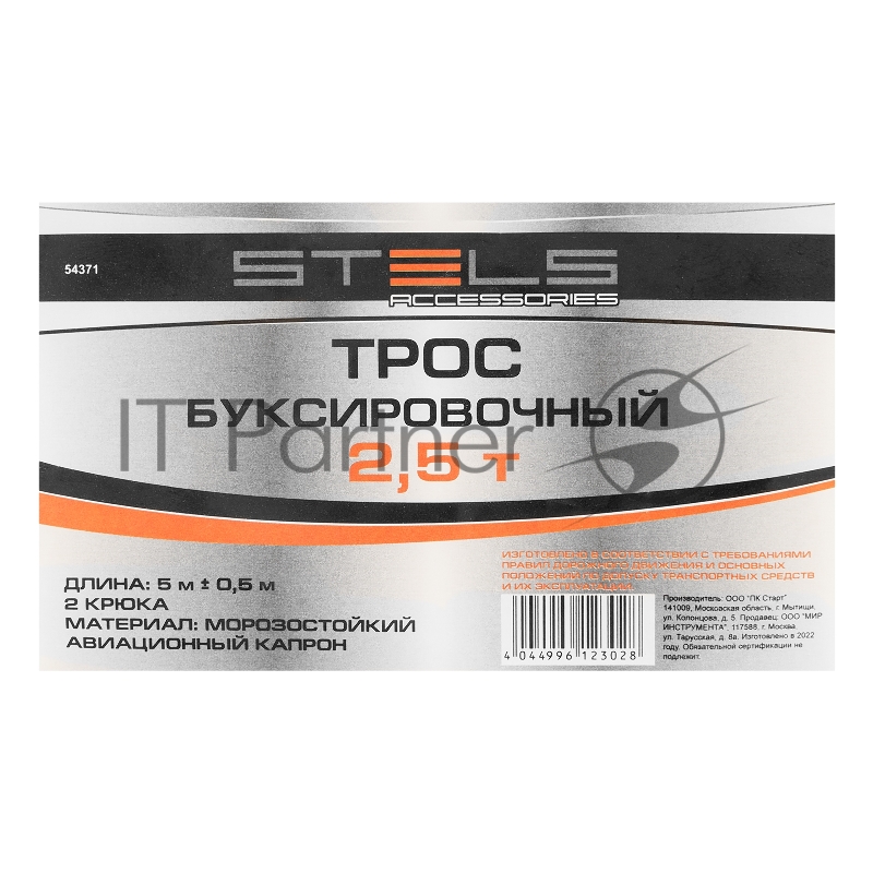 Трос буксировочный 2,5 тонны, 2 крюка, пакет, Россия// Stels