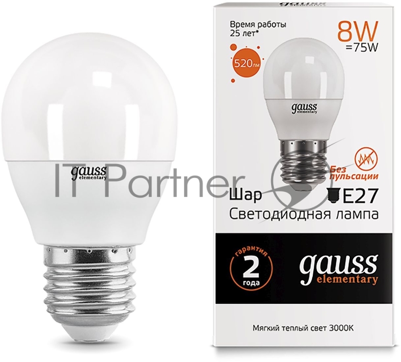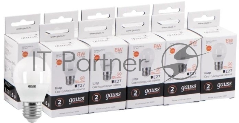 Лампа светодиодная Gauss Elementary 8Вт цок.:E27 шар 220B 3000K св.свеч.бел.теп. (упак.:10шт) (53218)