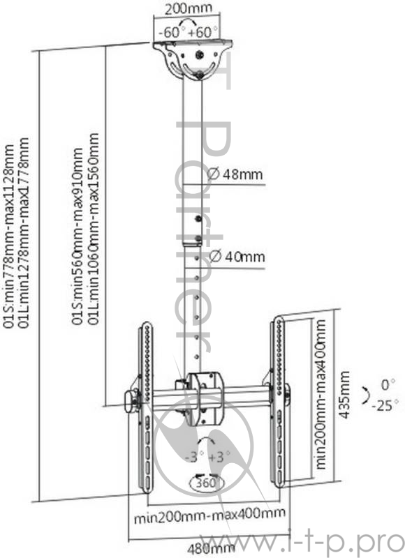 Описание: Потолочный кронштейн для LCD/LED телевизоров размером от 26 до 65 дюймов с максимальным весом до 50 кг. с возможностью крепления на наклонный потолок. Надежная стальная конструкция. Регулировка наклона 0-25 и углом поворота ±180 градусов. Максимальные крепежные размеры 400х400 мм.