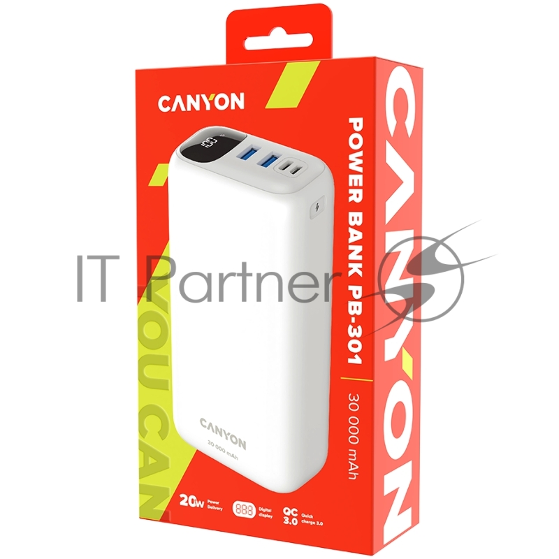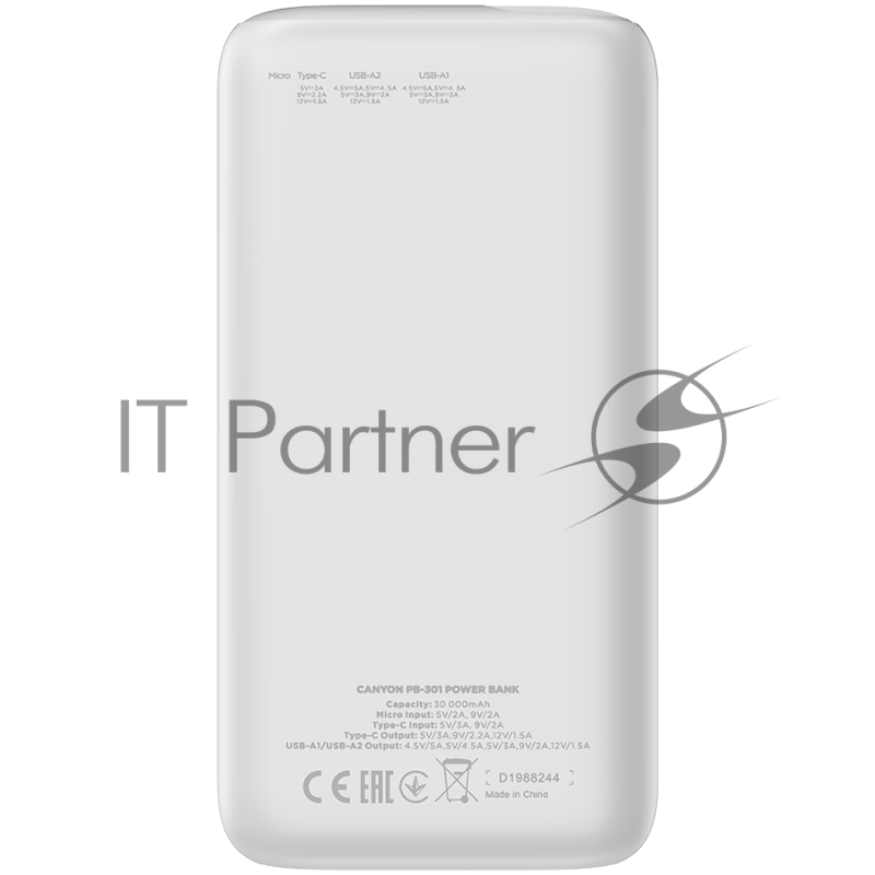 Мобильный аккумулятор CANYON PB - 301, Power bank 30000mAh Li-poly battery, Input Micro: DC5V/2A, 9V/2A Input Type c PD : DC5V/3A, 9V/2A, Output Type C PD:5V/3A,9V/2.2A,12V/1.5AOutput USB A1+USBA 2 : 5V3A,5V/4.5A,4.5V/5A,9V2A,12V1 quick cha
