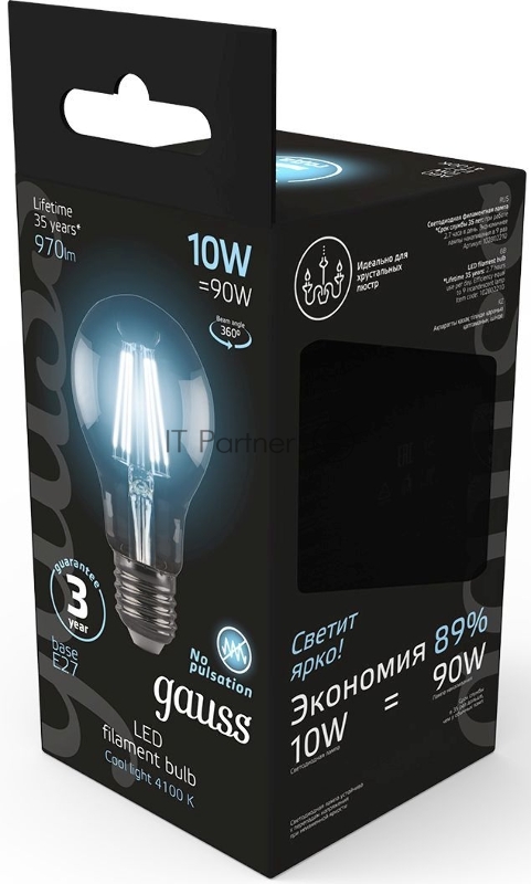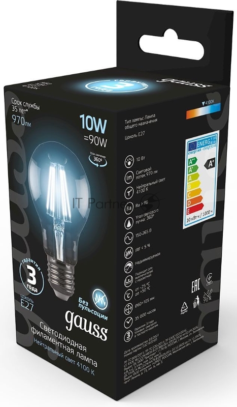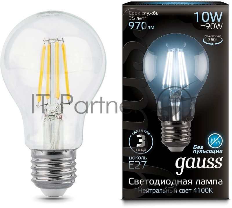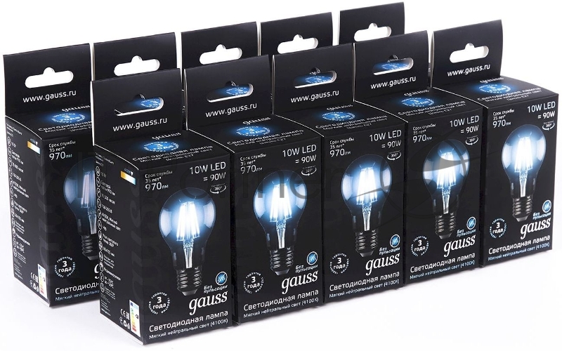 Лампа филам. Gauss 10Вт цок.:E27 шар 220B 4100K св.свеч.бел.ней. A60 (упак.:10шт) (102802210)