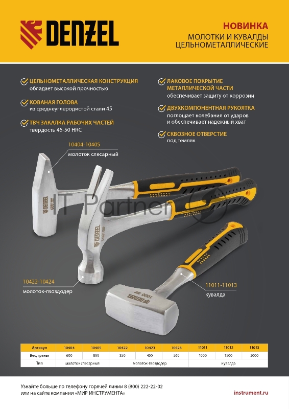 Молоток слесарный 800 г, цельнометаллический, двухкомпонентная рукоятка // Denzel
