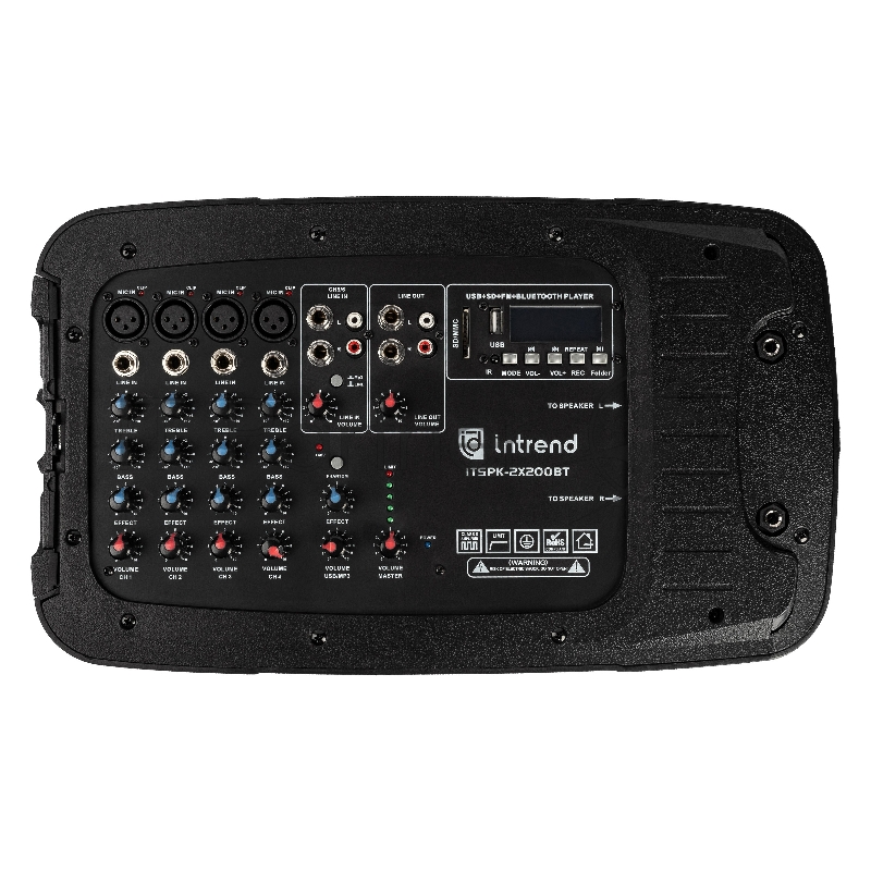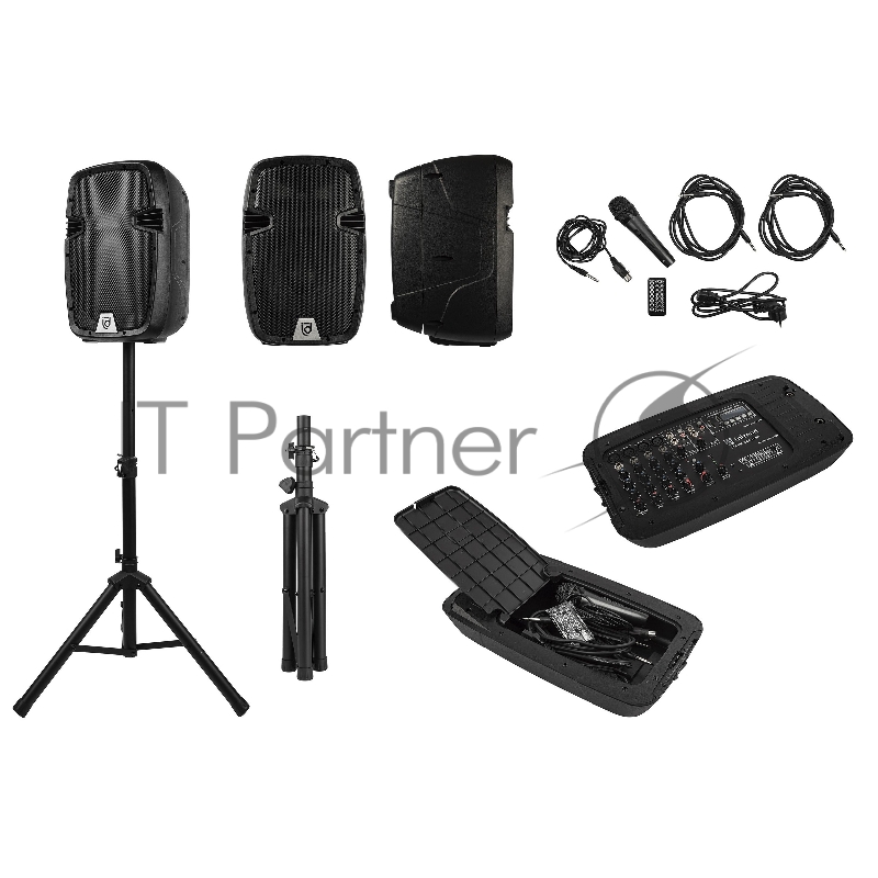 Комплект акустических систем INTREND [ITSPK-2X200BT] портативный, 400 Вт, 2 х 10+0.75, 6-канальный микшер, фантомное питание +48V, 24-bit FX, MP3 плеер, Bluetooth, 1 проводной микрофон, 2 стойки для а/с