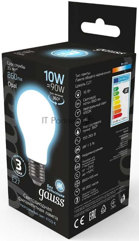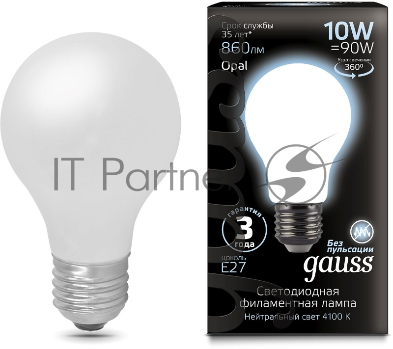 Лампа светодиодная Gauss 10Вт цок.:E27 шар 220B 4100K св.свеч.бел.нейт. A60 (упак.:10шт) (102202210)