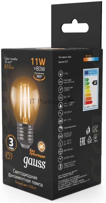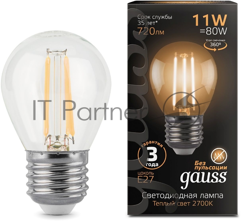 Лампа филам. Gauss 11Вт цок.:E27 шар 220B 2700K св.свеч.бел.теп. G45 (упак.:10шт) (105802111)