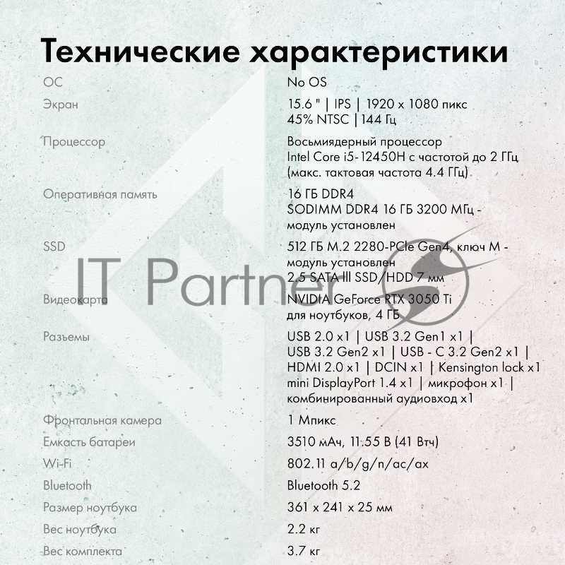 Ноутбук GMNG Skill Core i5 12450H 16Gb SSD512Gb NVIDIA GeForce RTX 3050 Ti 4Gb 15.6 IPS FHD (1920x1080) noOS black WiFi BT Cam 3410mAh (MN15P5-ADСN01)