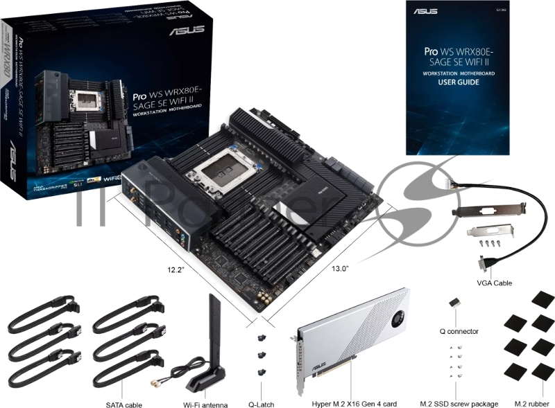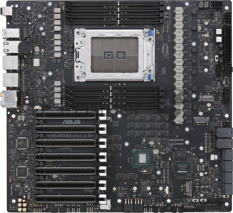 Материнская плата Asus PRO WS WRX80E-SAGE SE WIFI II AMD WRX80 Ryzen Threadripper PRO extended-ATX workstation motherboard with Intel dual 10G LAN, USB 3.2 Gen 2x2 Type-C port, 7 x PCIe 4.0 x16 slots, 3 x M.2 PCIe 4.0, ASMB9-iKVM, 2 x U.2 and 16 powe