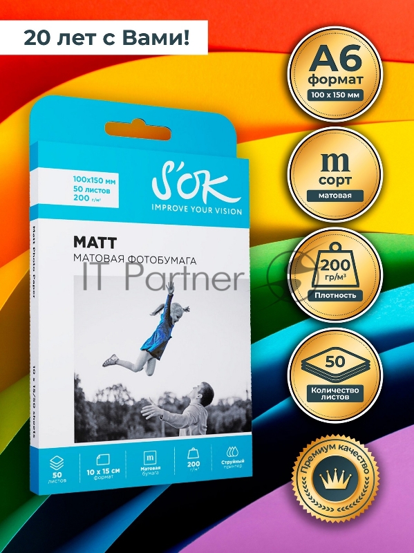 Фотобумага SOK матовая, формат 10x15, плотность 200г/м2, 50 листов SA6200050M