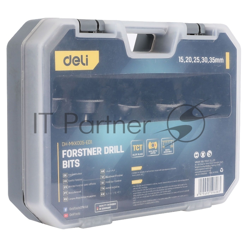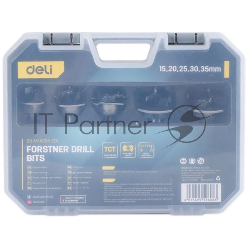 Набор сверл Форстнера 5 шт (15/20/25/30/35мм) Deli DH-MKK005-ED1 ограничитель глубины, пласт. кейс