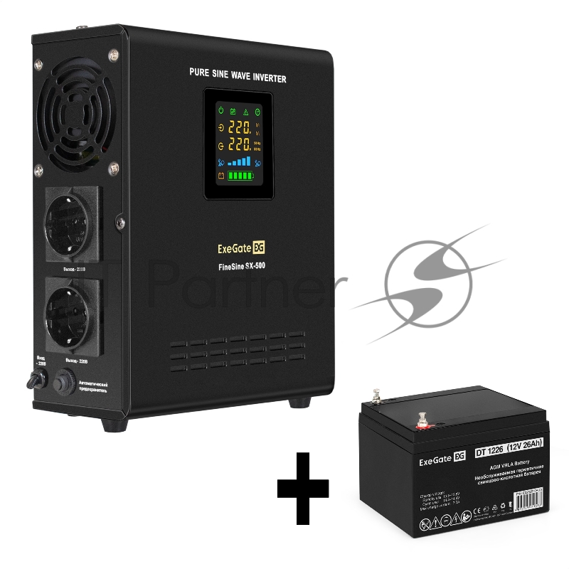 Комплект ИБП EX295995RUS + батарея 26Aч EX282970RUS 1шт (инвертор, синус, для котла, настенный) ExeGate FineSine SX-500.LCD.AVR.2SH <500VA/300W, чистая синусоида, цветной LCD-дисплей, AVR, 2*Schuko, линейно-интерактивный, крепление настенное/универса