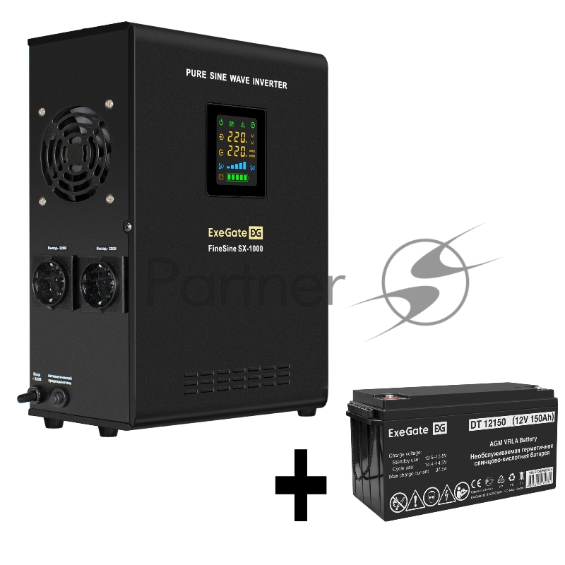 Комплект ИБП EX295997RUS + батарея 150Aч EX282990RUS 1шт (инвертор, синус, для котла, настенный) ExeGate FineSine SX-1000.LCD.AVR.2SH <1000VA/600W, чистая синусоида, цветной LCD-дисплей, AVR, 2*Schuko, линейно-интерактивный, крепление настенное/униве