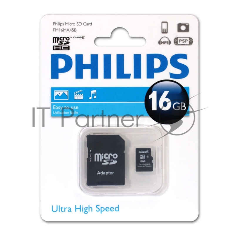 Флеш карта microSD 16GB PHILIPS microSDHC Class 10 (SD адаптер)
