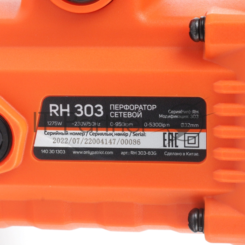 Перфоратор PATRIOT RH 303, SDS+, мощность 1275 Вт, 4.2 Дж, 3 режима работы, макс.диаметр 26мм, глубиномер, кейс