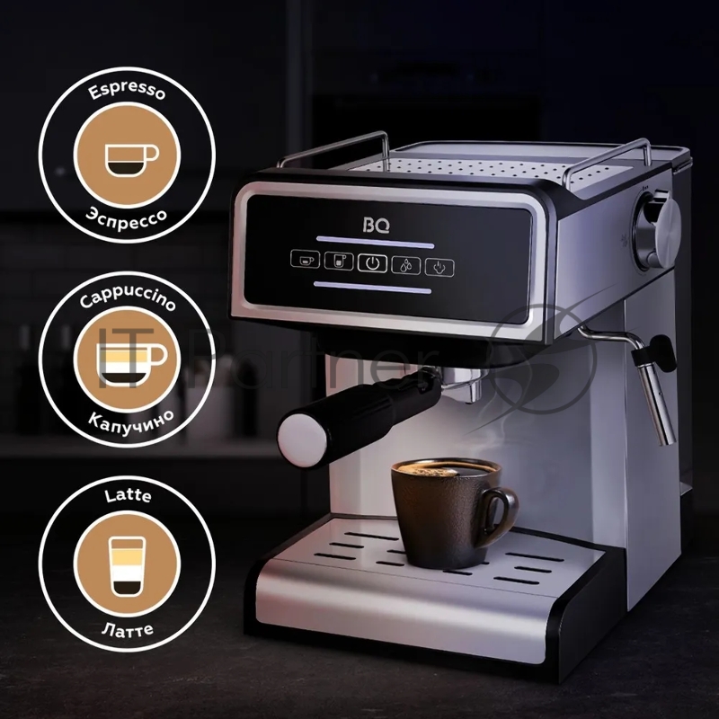 Кофеварка эспрессо BQ CM2000 Steel-Black, Мощность 850 Вт, Давление 15 бар, Объем 1.6 л, Итальянская помпа Ulka, Предварительное смачивание, Встроенный капучинатор, Платформа для хранения и подогрева чашек, Одновременное приготовление двух чашек кофе