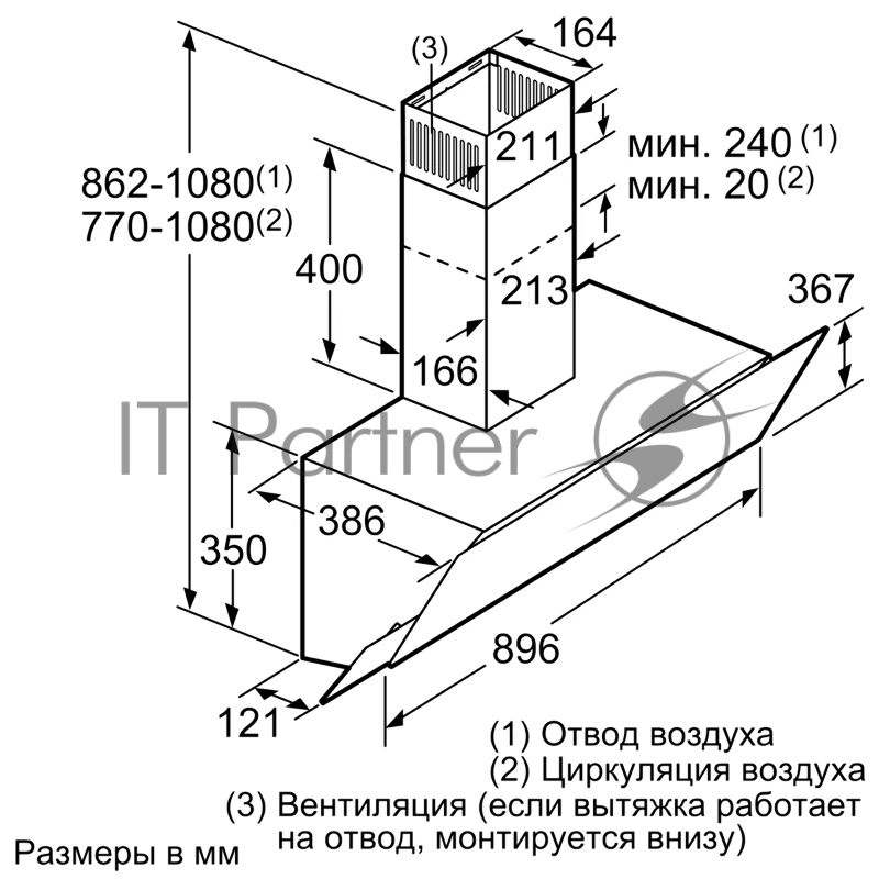 Наклонная вытяжка для настенного монтажа, максимальная производительность 630м3/ч, 90см, цвет: черный