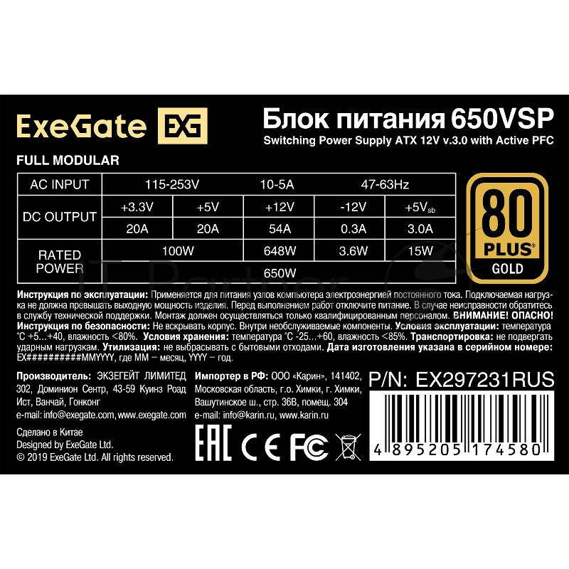 Блок питания 650W ExeGate 80 PLUS® GOLD 650VSP FС (ATX3.0, APFC, КПД 90% (80 PLUS GOLD), 120mm fan, 24pin, 2x(4+4)pin, PCIE5.0/12VHPWR, 2xPCI-E, 6xSATA, 3xIDE, 1xFDD, Full Cable Management, black, Color box)