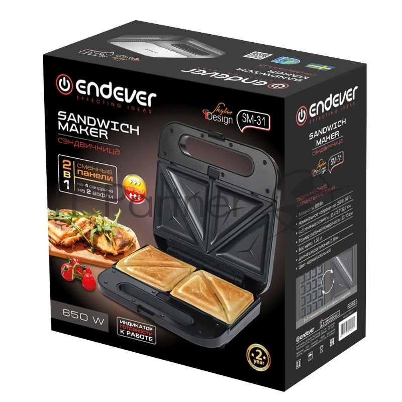 Сэндвичница электрическая Endever Skyline SM-31 2 в 1, черный/стальной, мощность 850 Вт, автом. терморегулятор, размеры 23,4*22,7 см, 4 шт/уп
