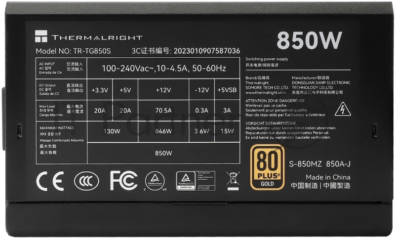 Блок питания Thermalright, 850W 80+ Gold (ATX, 3.0, PCIe 5.0, Non-modular, 1x24(20+4)pin, 1xCPU 8(4+4)pin, 2xPCIe*2 8(6+2)pin, 5xSATA3, 1x12+4pin (12VHPWR PCIe 5.0 12+4pin 600mm), 3xMOLEX4pin, Active, 120x120mm, 150x140x86mm, APFC, black)