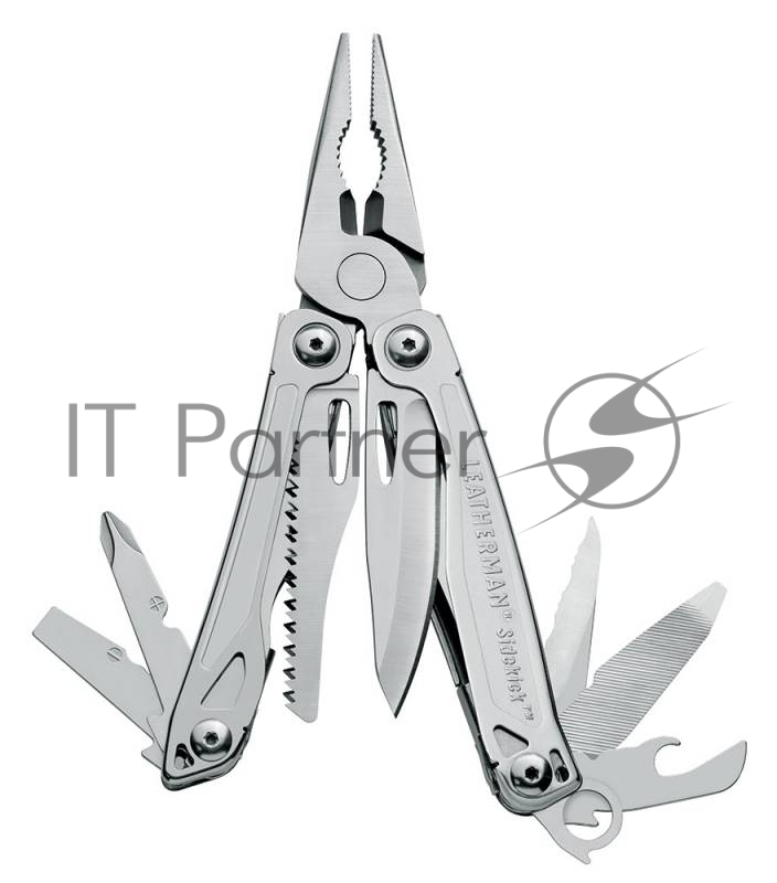Описание: Нож прямой, нож серрейторный, напильник по дереву и металлу (крупный и мелкий), пила, плоскогубцы, кусачки, 3 отвертки (2 - плоские, 1 - крестообразная), консервный нож с приспособлением для снятия изоляции, открывалка для бутылок, страховочное кольцо. Все опции фиксируются от случайного закрытия.