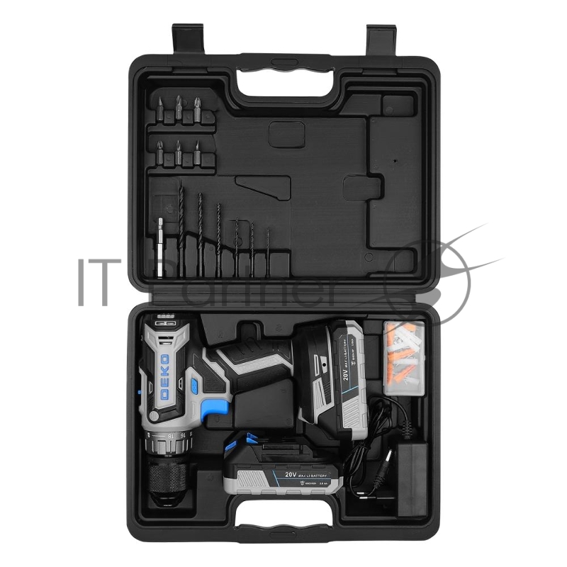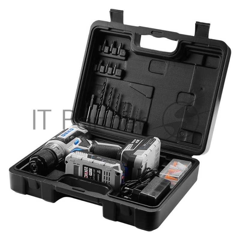 Аккумуляторная дрель-шуруповерт DEKO DKCD20V ONE + в кейсе + набор 63 инструмента для дома, 20В, 2x2.0Ач